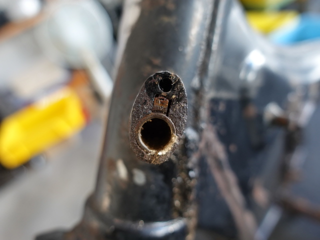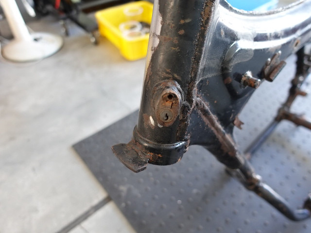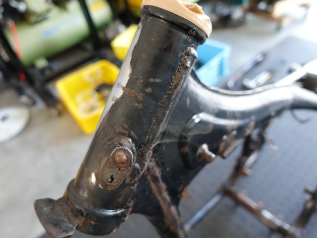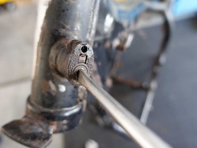 鍵が抜けました。本来であればフレームに残っているシリンダーも抜けてくるはずなのですが、固着していて抜けない状態です。厄介ですね!!